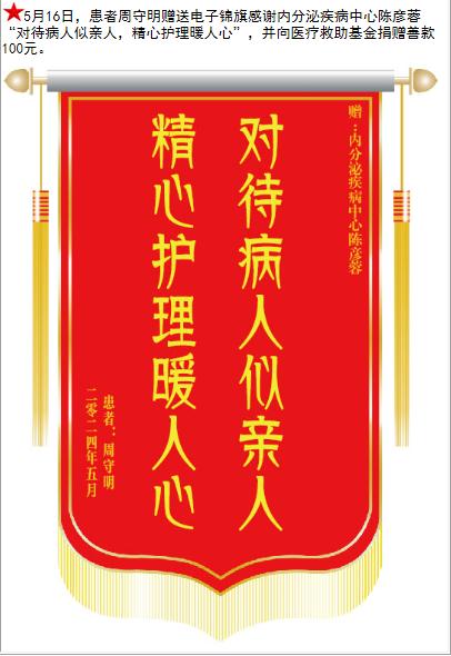 患者周守明赠送电子锦旗感谢内分泌疾病中心陈彦蓉,并向医疗救助基金捐赠善款100元。