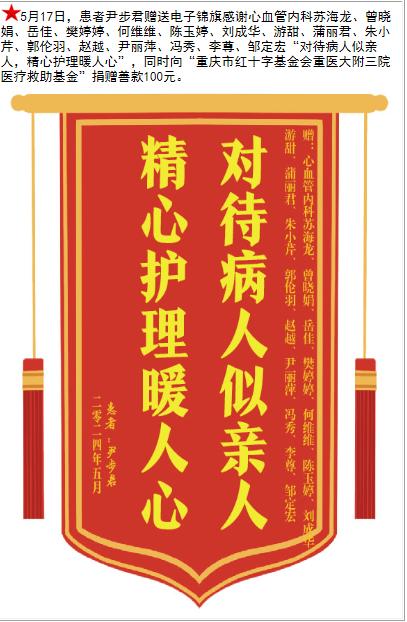 患者尹步君赠送电子锦旗感谢心血管内科苏海龙等人,并向医疗救助基金捐赠善款100元。-锦旗-患者心声-患者服务-重庆医科大学附属第三医院【官方网站】