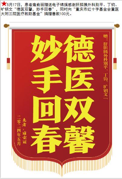 患者雍俞丽赠送电子锦旗感谢肝胆胰外科别平等人,并向医疗救助基金捐赠善款100元。-锦旗-患者心声-患者服务-重庆医科大学附属第三医院【官方网站】
