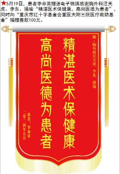 患者李命英赠送电子锦旗感谢胸外科汪天虎等人,并向医疗救助基金捐赠善款100元。-锦旗-患者心声-患者服务-重庆医科大学附属第三医院【官方网站】