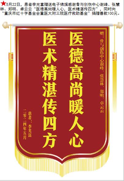患者李光富赠送电子锦旗感谢骨与创伤中心谢峰等人,并向医疗救助基金捐赠善款100元。-锦旗-患者心声-患者服务-重庆医科大学附属第三医院【官方网站】
