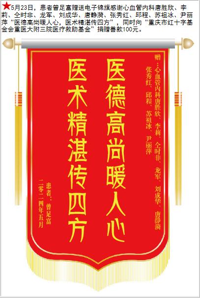 患者曾足富赠送电子锦旗感谢心血管内科唐胜欣等人,并向医疗救助基金捐赠善款100元。-锦旗-患者心声-患者服务-重庆医科大学附属第三医院【官方网站】