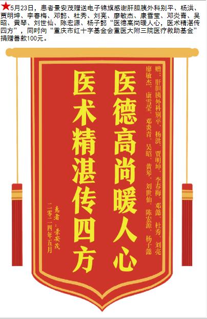 患者景安茂赠送电子锦旗感谢肝胆胰外科别平等人,并向医疗救助基金捐赠善款100元。-锦旗-患者心声-患者服务-重庆医科大学附属第三医院【官方网站】