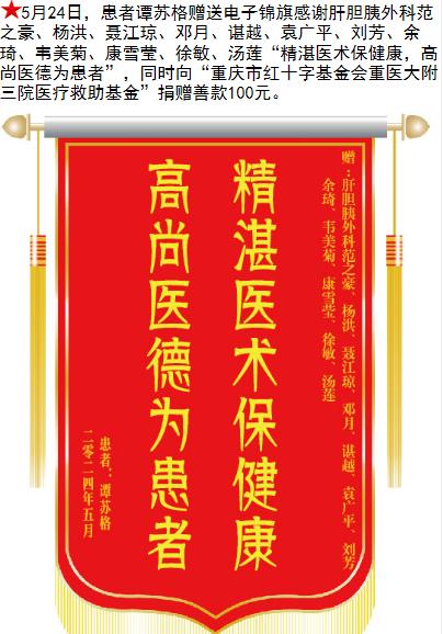 患者谭苏格赠送电子锦旗感谢肝胆胰外科范之豪等人,并向医疗救助基金捐赠善款100元。-锦旗-患者心声-患者服务-重庆医科大学附属第三医院【官方网站】