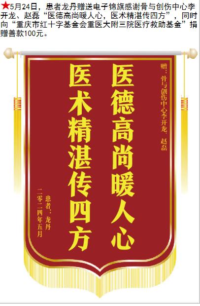 患者龙丹赠送电子锦旗感谢骨与创伤中心李开龙等人,并向医疗救助基金捐赠善款100元。-锦旗-患者心声-患者服务-重庆医科大学附属第三医院【官方网站】