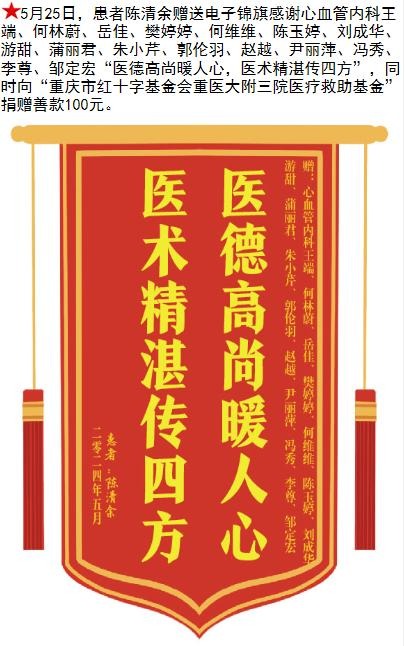 患者陈清余赠送电子锦旗感谢心血管内科王端等人,并向医疗救助基金捐赠善款100元。-锦旗-患者心声-患者服务-重庆医科大学附属第三医院【官方网站】