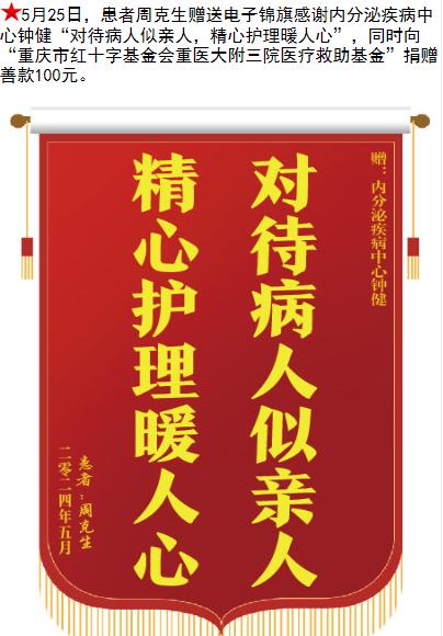 患者周克生赠送电子锦旗感谢内分泌疾病中心钟健,并向医疗救助基金捐赠善款100元。-锦旗-患者心声-患者服务-重庆医科大学附属第三医院【官方网站】