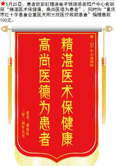 患者欧彩虹赠送电子锦旗感谢妇产中心俞丽丽,并向医疗救助基金捐赠善款100元。-锦旗-患者心声-患者服务-重庆医科大学附属第三医院【官方网站】