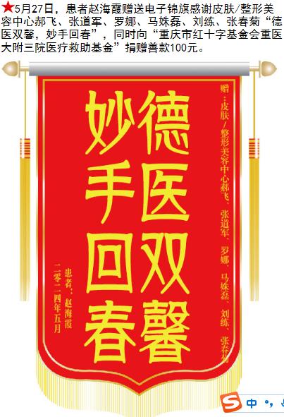 患者赵海霞赠送电子锦旗感谢皮肤/整形美容中心郝飞等人,并向医疗救助基金捐赠善款100元。-锦旗-患者心声-患者服务-重庆医科大学附属第三医院【官方网站】