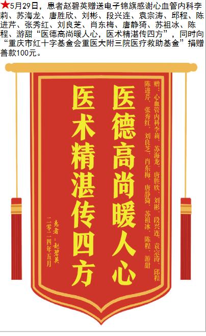 患者赵碧英赠送电子锦旗感谢心血管内科李莉等人,并向医疗救助基金捐赠善款100元。-锦旗-患者心声-患者服务-重庆医科大学附属第三医院【官方网站】