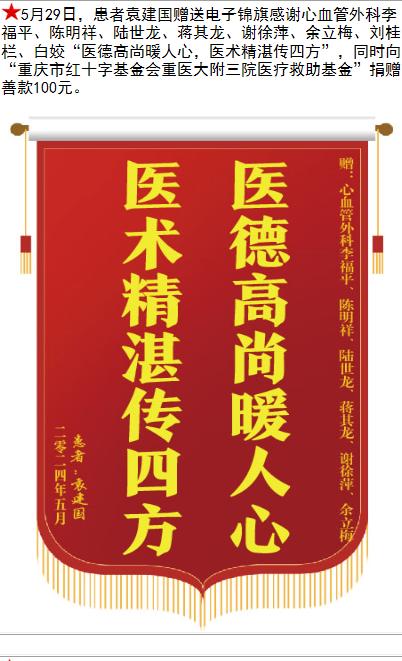 患者袁建国赠送电子锦旗感谢心血管外科李福平等人,并向医疗救助基金捐赠善款100元。-锦旗-患者心声-患者服务-重庆医科大学附属第三医院【官方网站】
