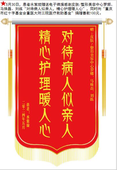患者水紫璇赠送电子锦旗感谢皮肤/整形美容中心罗娜,并向医疗救助基金捐赠善款100元。-锦旗-患者心声-患者服务-重庆医科大学附属第三医院【官方网站】