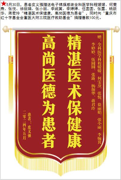 患者皮义强赠送电子锦旗感谢全科医学科程媛媛等人,并向医疗救助基金捐赠善款100元。-锦旗-患者心声-患者服务-重庆医科大学附属第三医院【官方网站】