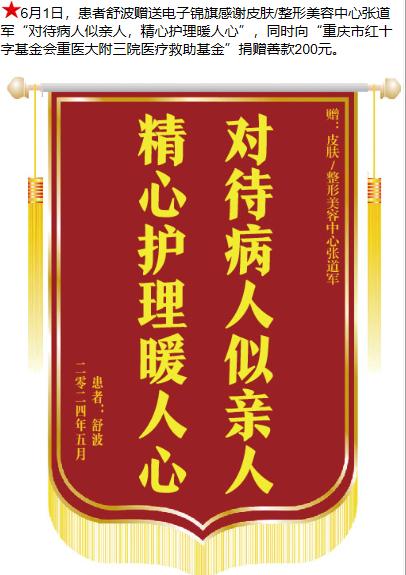 患者舒波赠送电子锦旗感谢皮肤/整形美容中心张道军,并向医疗救助基金捐赠善款200元。-锦旗-患者心声-患者服务-重庆医科大学附属第三医院【官方网站】