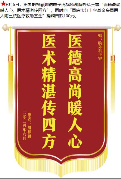 患者胡梓颖赠送电子锦旗感谢胸外科王睿,并向医疗救助基金捐赠善款100元。-锦旗-患者心声-患者服务-重庆医科大学附属第三医院【官方网站】