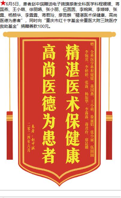 患者赵中琪赠送电子锦旗感谢全科医学科程媛媛等人,并向医疗救助基金捐赠善款100元。-锦旗-患者心声-患者服务-重庆医科大学附属第三医院【官方网站】