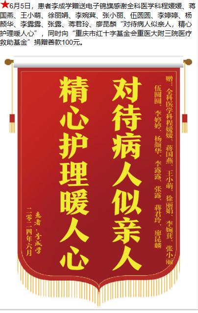 患者李成学赠送电子锦旗感谢全科医学科程媛媛等人,并向医疗救助基金捐赠善款100元。-锦旗-患者心声-患者服务-重庆医科大学附属第三医院【官方网站】