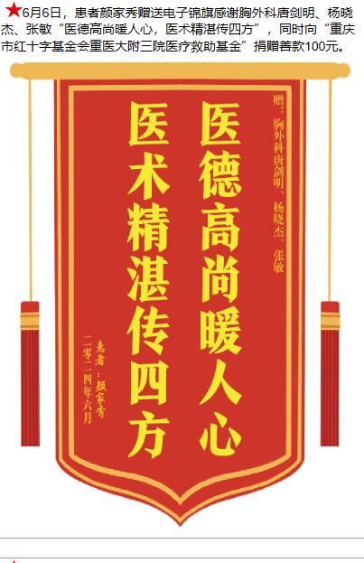 患者颜家秀赠送电子锦旗感谢胸外科唐剑明等人,并向医疗救助基金捐赠善款100元。-锦旗-患者心声-患者服务-重庆医科大学附属第三医院【官方网站】