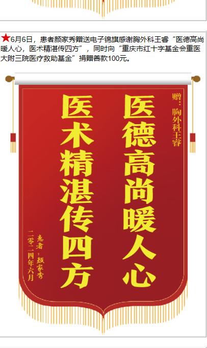 患者颜家秀赠送电子锦旗感谢胸外科王睿,并向医疗救助基金捐赠善款100元。-锦旗-患者心声-患者服务-重庆医科大学附属第三医院【官方网站】