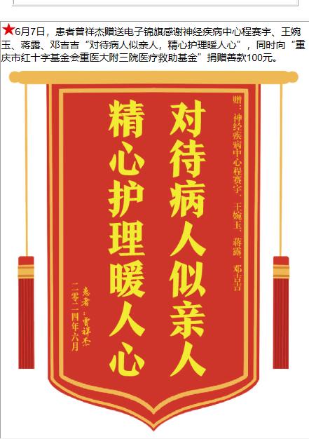 患者曾祥杰赠送电子锦旗感谢神经疾病中心程赛宇等人,并向医疗救助基金捐赠善款100元。-锦旗-患者心声-患者服务-重庆医科大学附属第三医院【官方网站】