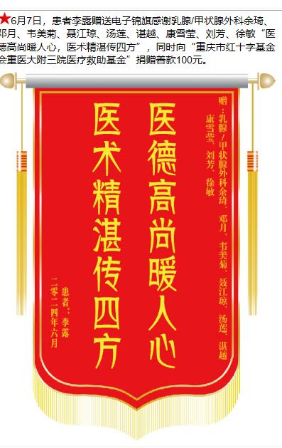 患者李露赠送电子锦旗感谢乳腺/甲状腺外科余琦等人,并向医疗救助基金捐赠善款100元。-锦旗-患者心声-患者服务-重庆医科大学附属第三医院【官方网站】
