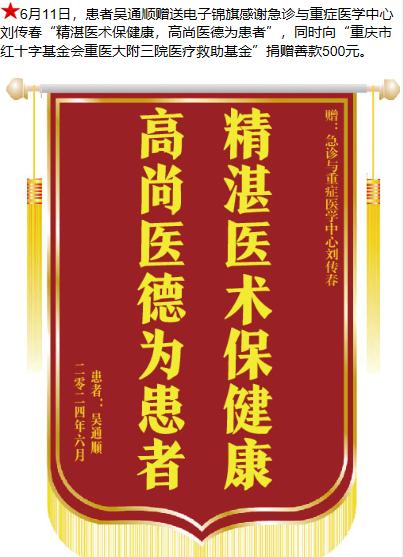 患者吴通顺赠送电子锦旗感谢急诊与重症医学中心刘传春, 并向医疗救助基金捐赠善款500元。-锦旗-患者心声-患者服务-重庆医科大学附属第三医院【官方网站】