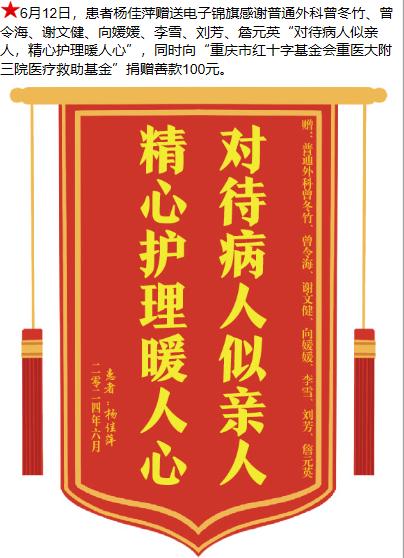 患者杨佳萍赠送电子锦旗感谢普通外科曾冬竹等人,并向医疗救助基金捐赠善款100元。-锦旗-患者心声-患者服务-重庆医科大学附属第三医院【官方网站】