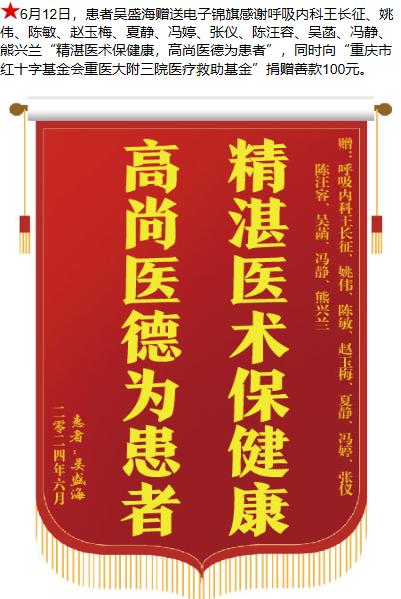 患者吴盛海赠送电子锦旗感谢呼吸内科王长征等人,并向医疗救助基金捐赠善款100元。-锦旗-患者心声-患者服务-重庆医科大学附属第三医院【官方网站】