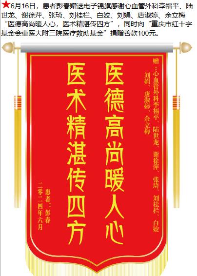 患者彭春赠送电子锦旗感谢心血管外科李福平等人,并向医疗救助基金捐赠善款100元。-锦旗-患者心声-患者服务-重庆医科大学附属第三医院【官方网站】