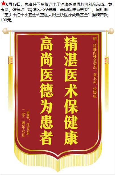 患者任卫东赠送电子锦旗感谢肾脏内科余荣杰等人,并向医疗救助基金捐赠善款100元。-锦旗-患者心声-患者服务-重庆医科大学附属第三医院【官方网站】