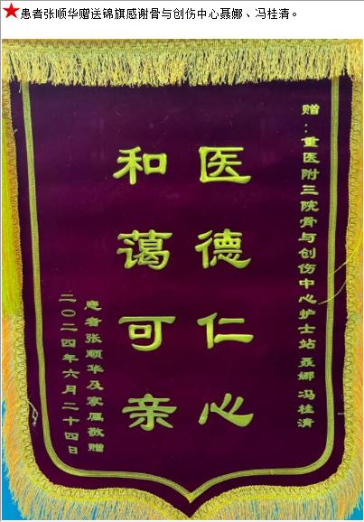 患者张顺华赠送锦旗感谢骨与创伤中心聂娜等人。