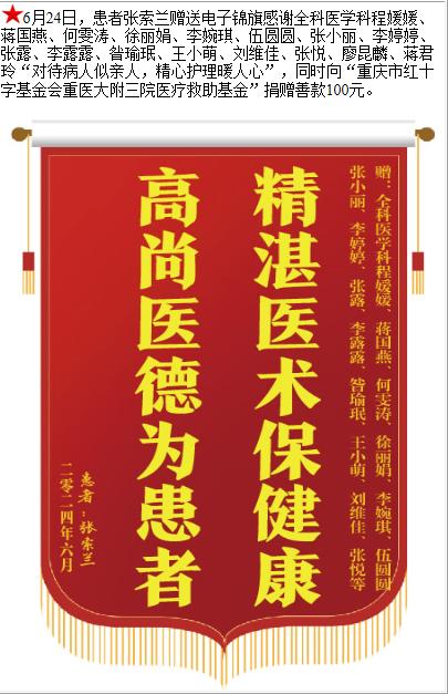 患者张索兰赠送电子锦旗感谢全科医学科程媛媛,并向医疗救助基金捐赠善款100元。-锦旗-患者心声-患者服务-重庆医科大学附属第三医院【官方网站】
