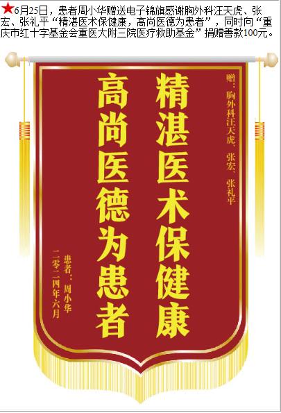 患者周小华赠送电子锦旗感谢胸外科汪天虎等人,并向医疗救助基金捐赠善款100元。-锦旗-患者心声-患者服务-重庆医科大学附属第三医院【官方网站】