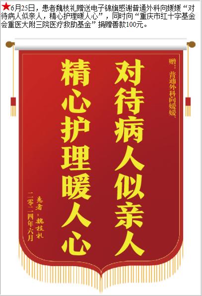 患者魏枝礼赠送电子锦旗感谢普通外科向媛媛,并向医疗救助基金捐赠善款100元。-锦旗-患者心声-患者服务-重庆医科大学附属第三医院【官方网站】