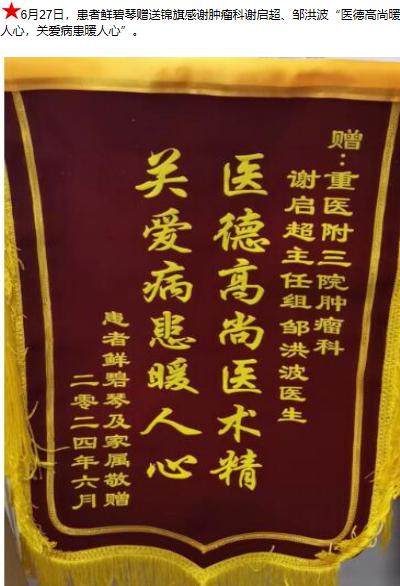 患者鲜碧琴赠送锦旗感谢肿瘤科谢启超等人。-锦旗-患者心声-患者服务-重庆医科大学附属第三医院【官方网站】