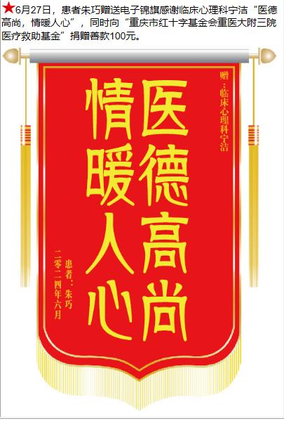 患者朱巧赠送电子锦旗感谢临床心理科宁洁,并向医疗救助基金捐赠善款100元。-锦旗-患者心声-患者服务-重庆医科大学附属第三医院【官方网站】