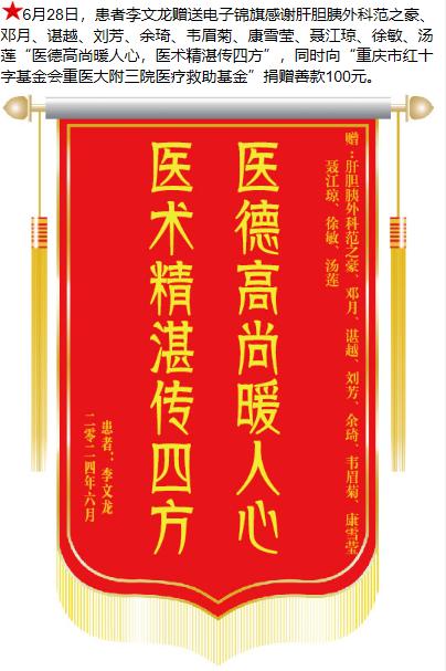 患者李文龙赠送电子锦旗感谢肝胆胰外科范之豪等人,并向医疗救助基金捐赠善款100元。-锦旗-患者心声-患者服务-重庆医科大学附属第三医院【官方网站】
