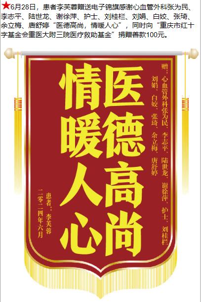 患者李芙蓉赠送电子锦旗感谢心血管外科张为民等人,并向医疗救助基金捐赠善款100元。-锦旗-患者心声-患者服务-重庆医科大学附属第三医院【官方网站】