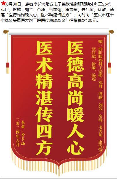 患者李长海赠送电子锦旗感谢肝胆胰外科王安彬等人,并向医疗救助基金捐赠善款100元。-锦旗-患者心声-患者服务-重庆医科大学附属第三医院【官方网站】
