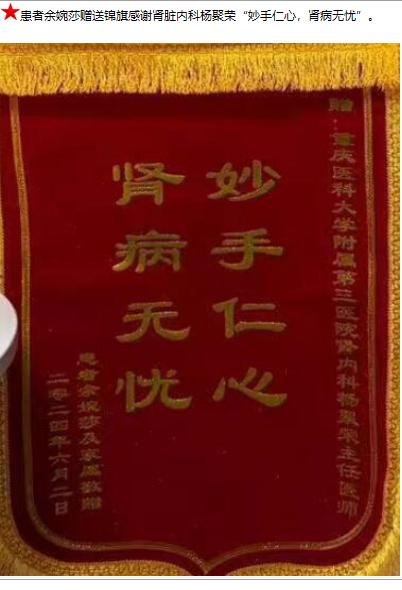 患者余婉莎赠送锦旗感谢肾脏内科杨聚荣。-锦旗-患者心声-患者服务-重庆医科大学附属第三医院【官方网站】