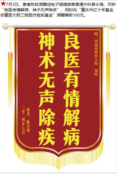 患者陈自周赠送电子锦旗感谢普通外科曾令海等人,并向医疗救助基金捐赠善款100元。-锦旗-患者心声-患者服务-重庆医科大学附属第三医院【官方网站】