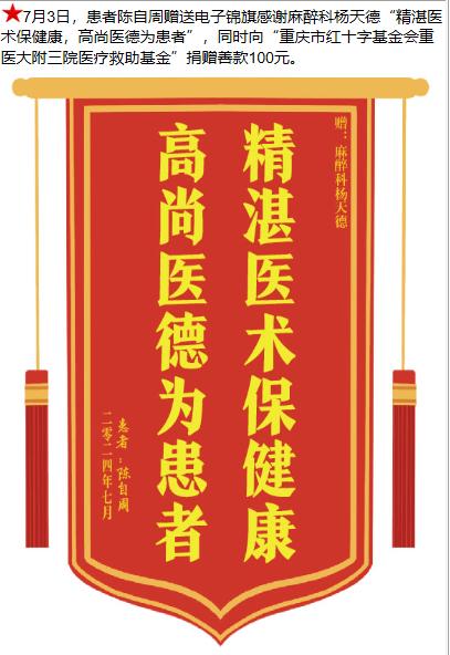患者陈自周赠送电子锦旗感谢麻醉科杨天德,并向医疗救助基金捐赠善款100元。-锦旗-患者心声-患者服务-重庆医科大学附属第三医院【官方网站】