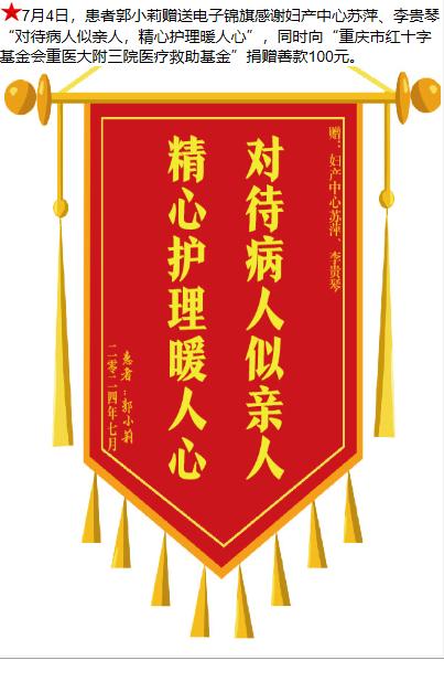 患者郭小莉赠送电子锦旗感谢妇产中心苏萍等人,并向医疗救助基金捐赠善款100元。-锦旗-患者心声-患者服务-重庆医科大学附属第三医院【官方网站】