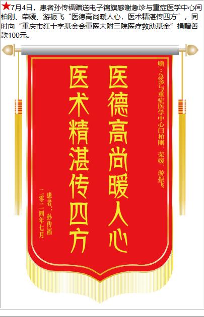 患者孙传福赠送电子锦旗感谢急诊与重症医学中心闫柏刚等人,并向医疗救助基金捐赠善款100元。-锦旗-患者心声-患者服务-重庆医科大学附属第三医院【官方网站】