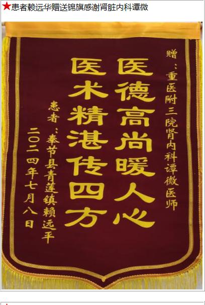 患者赖远华赠送锦旗感谢肾脏内科谭微。-锦旗-患者心声-患者服务-重庆医科大学附属第三医院【官方网站】