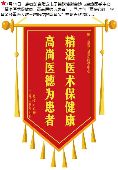 患者彭春赠送电子锦旗感谢急诊与重症医学中心医护人员,并向医疗救助基金捐赠善款100元。-锦旗-患者心声-患者服务-重庆医科大学附属第三医院【官方网站】