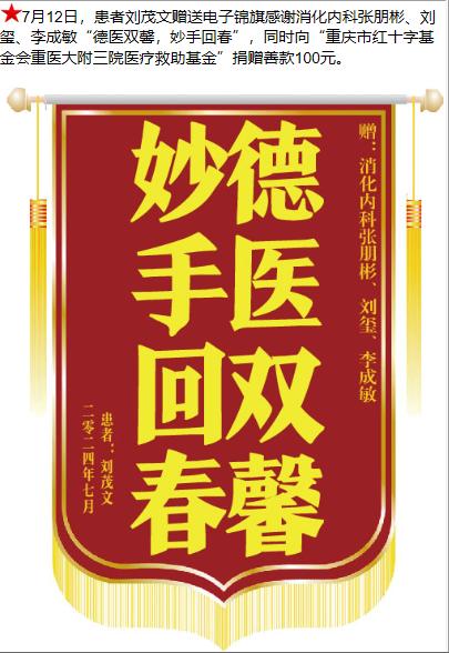 患者刘茂文赠送电子锦旗感谢消化内科张朋彬等人,并向医疗救助基金捐赠善款100元。-锦旗-患者心声-患者服务-重庆医科大学附属第三医院【官方网站】