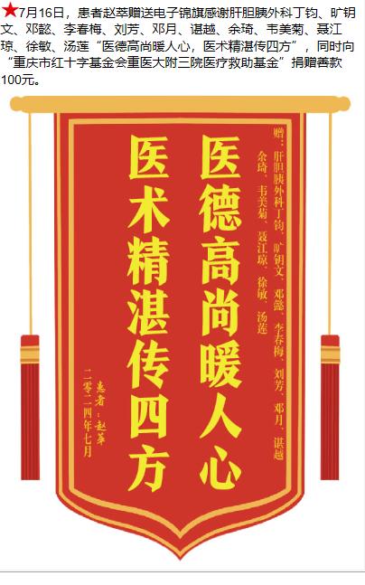 患者赵萃赠送电子锦旗感谢肝胆胰外科丁钧等人,并向医疗救助基金捐赠善款100元。-锦旗-患者心声-患者服务-重庆医科大学附属第三医院【官方网站】