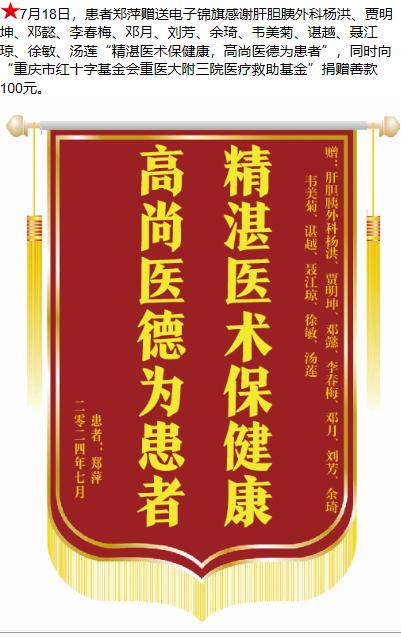 患者郑萍赠送电子锦旗感谢肝胆胰外科杨洪等人,并向医疗救助基金捐赠善款100元。-锦旗-患者心声-患者服务-重庆医科大学附属第三医院【官方网站】