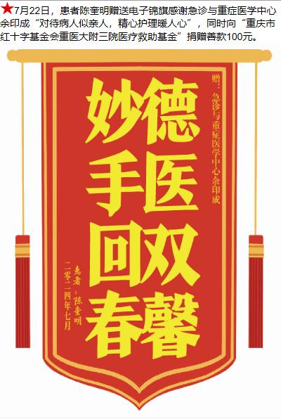 患者陈奎明赠送电子锦旗感谢急诊与重症医学中心余印成,并向医疗救助基金捐赠善款100元。-锦旗-患者心声-患者服务-重庆医科大学附属第三医院【官方网站】